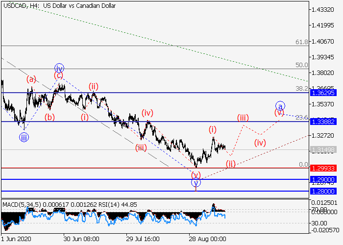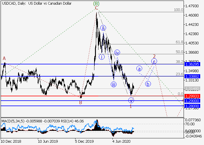 On the daily chart, the downward wave of the higher level (C) develops, within which the first wave 1 of (C) formed. Now, an upward correction has started to develop as the second wave 2 of (C), within which the wave a of 2 is forming. If the assumption is correct, the pair will grow to the levels of 1.3388–1.3629. In this scenario, critical stop loss level is 1.2993.