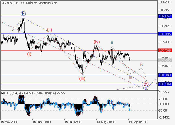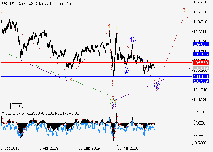 Pada carta harian, pembetulan ke bawah dari tahap yang lebih tinggi berkembang sebagai wave 2, di mana wave c dari 2 terbentuk. Sekarang, wave kelima dari tahap bawah (v) dari c berkembang, di mana wave ii dari (v) telah berakhir, dan wave iii dari (v) terbentuk. Sekiranya jangkaan betul, pasangan akan jatuh ke tahap 104.19–103.30. Dalam senario ini, tahap stop loss kritikal adalah 106.56.