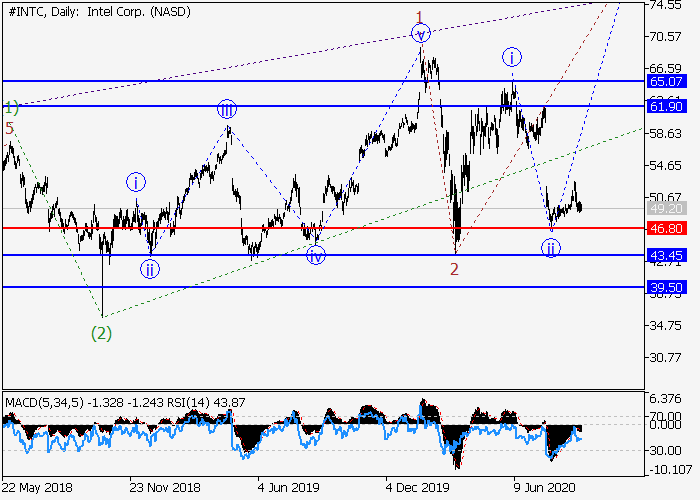 No gráfico diário há o desenvolvimento da terceira onda do nível superior (3), na qual uma onda de 1 de (3) se formou. No momento, o desenvolvimento da correção local como a onda de 2 de (3) foi concluído e a formação da onda 3 de (3) está a começar. Se a hipótese for verdadeira, então o preço subirá para as marcas 61.90–65.07. O nível crítico de stop-loss para este cenário é a marca de 46.80.