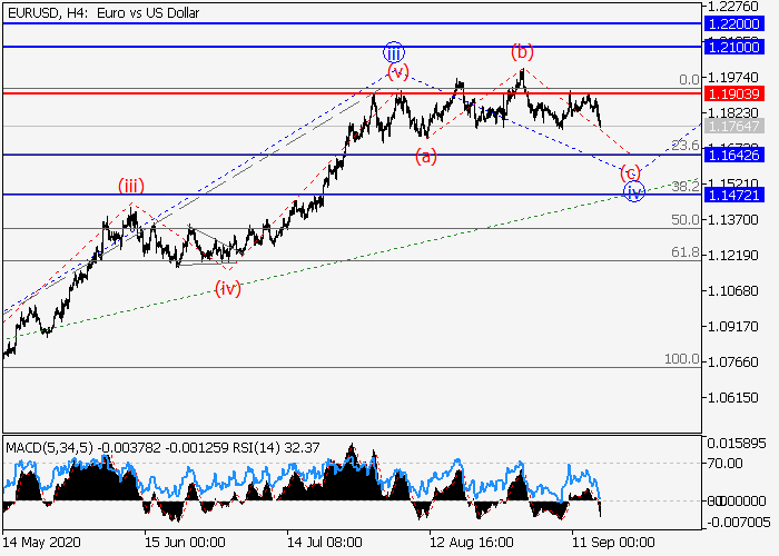 No gráfico diário, o desenvolvimento da primeira onda do nível superior 1 de (3) continua, na qual a onda iii de 1 foi formada. Atualmente, o desenvolvimento da correção local continua o seu desenvolvimento como a quarta onda iv de 1, na qual a onda (c) de iv se está a formar. Se a suposição estiver correta, o par cairá para 1.1642–1.1472. O nível crítico de stop loss para este cenário é a marca 1.1903.