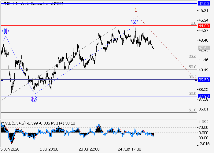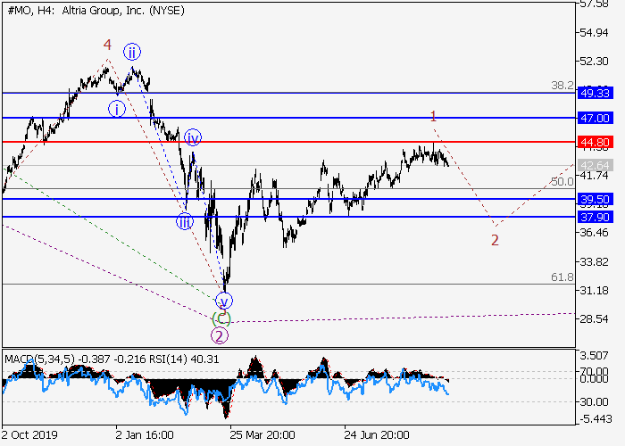 4 saatlik grafikte dalga 2 şeklindeki aşağı yönlü yüksek dereceli düzeltmenin gelişimi tamamlandı ve içinde dalga (1) of 3 gelişmekte olan dalga 3 oluşumu başladı. Şu anda düşük dereceli 1. dalga 1 of (1) oluştu, ve dalga 2 of (1) şeklindeki lokal düzeltmenin gelişimi başladı. Tahmin doğru ise fiyat 39.50–37.90 değerlerine iner. Bu senaryo için 44.80 değeri kritik zarar durdur seviyesidir.